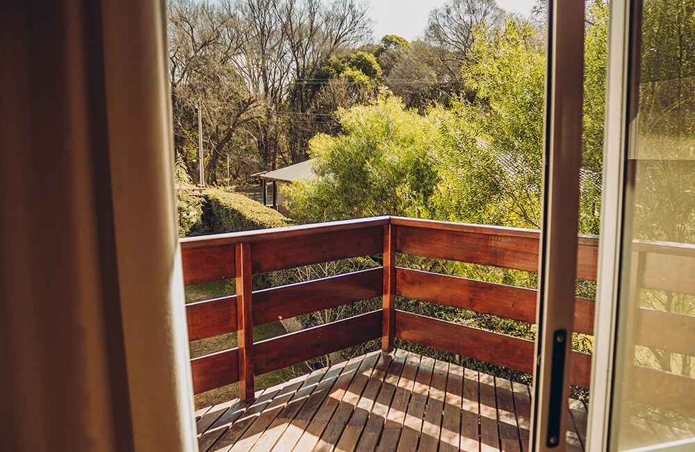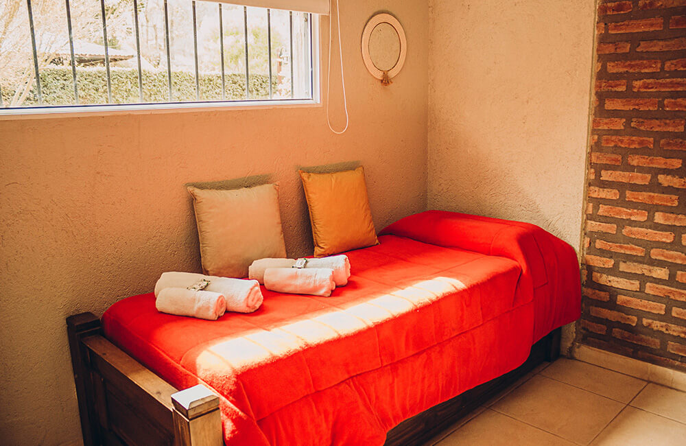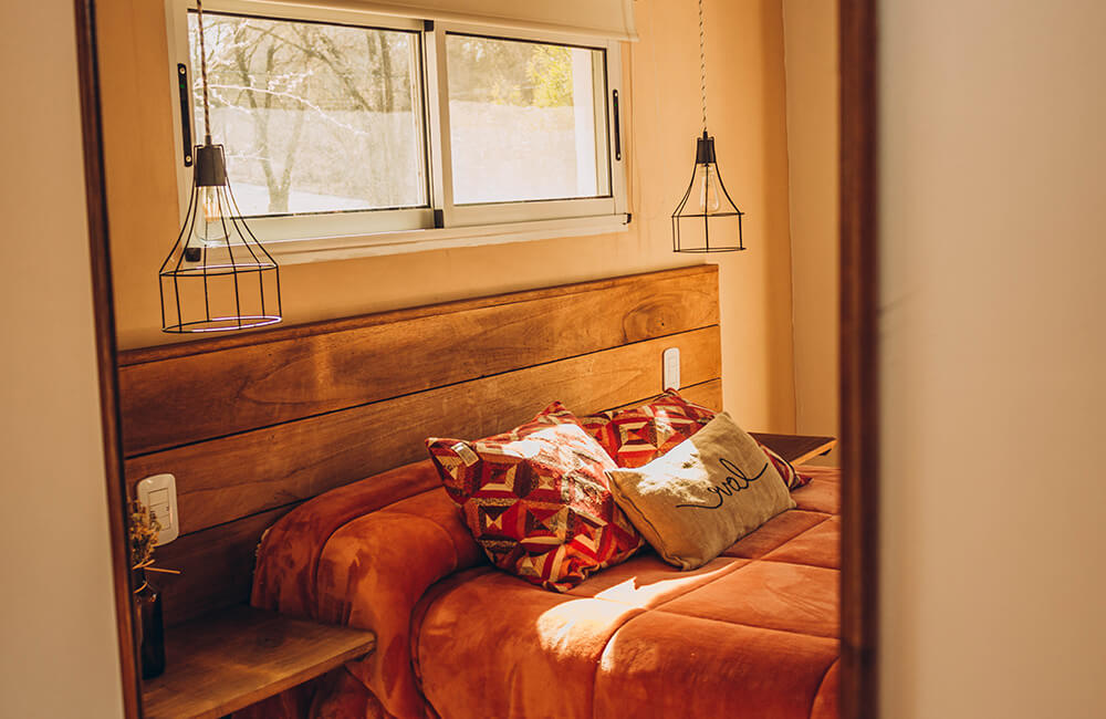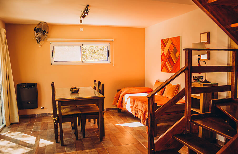Medio dormitorio con cama individual en planta alta y diván cama en el extremo del comedor